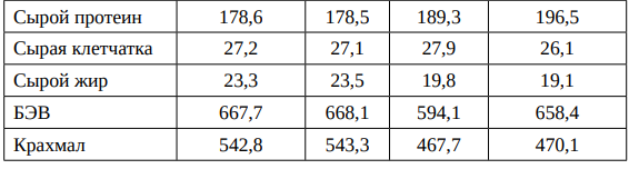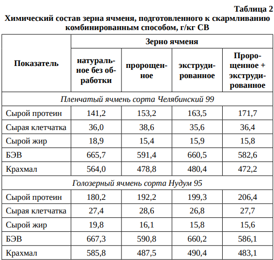 2. Подготовка ячменя к скармливанию комплексным методом (проращивание + экструдирование) способствовало увеличению в корме сырого протеина, по сравнению с другими способами. Однако наблюдается снижение в зерне содержания сырого жира, БЭВ и крахмала. При этом питательные вещества корма переходят в более усвояемую форму.