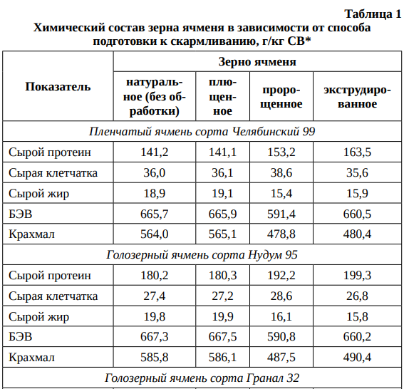 Зерно ячменя подвергали различным способам обработки: плющение, проращивание, экструдирование. Анализ химического состава зерна проводили на базе аккредитованной производственной лаборатории ООО «Объединение «Союзпищепром». В зерне определяли сырой протеин методом Кьельдаля, содержание сырого жира – экстрагированием в аппарате Сокслета; сырой клетчатки – по Кюшнеру и Ганеку в модификации Когана; крахмал – ГОСТ 26176-91 «Корма, комбикорма. Методы определения растворимых и легкогидролизуемых углеводов».