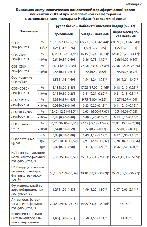 Анализ результатов выявил клинико-иммунологическую эффективность использования препарата Нобазит® (энисамия йодид), применение которого в комплексной терапии ОРВИ уменьшает клинические проявления вирусной интоксикации, способствует сокращению продолжительности заболевания, характеризуется хорошей переносимостью: побочных явлений у пациентов не отмечено.