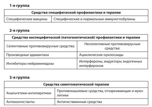 Лекарственные средства, используемые в терапии ОРВИ, можно условно разделить на три основные группы [12] (представлены ниже).
