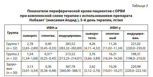 Нормализация сывороточной, спонтанной индуцированной продукции интерферонов α и γ произошло на 5-й день в группе 1, где пациенты получали комплексную терапию ОРВИ с использованием препарата Нобазит® (энисамия йодид) на 5-й день терапии.