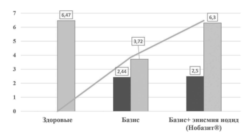 2. Комплексная терапия с использованием препарата Нобазит® (энисамия йодид) стимулирует и нормализует лимфоцитарный рецепторный пейзаж, функциональную активность фагоцитов периферической крови, что проявляется в нормализации абсолютного и относительного количества нейтрофилов, восстановлении потенциала реакций НСТ-теста нейтрофилов, повышении функционального резерва, усилении поглотительных способностей и фагоцитарного числа нейтрофилов.