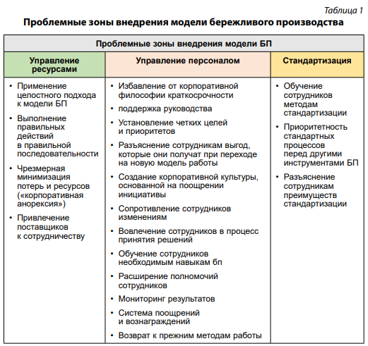 Многие российские производственные компании сталкиваются с трудностями при внедрении и эксплуатации модели бережливого производства (БП). Трудности, например, могут возникать из-за поверхностного обучения приемам, практикам и инструментам БП, а также из-за непонимания философии, лежащей в основе системы БП. Рассмотрим три группы проблемных зон, которые, по мнению авторов, наиболее характерны для предприятий, внедряющих модель бережливого производства: (1) управление ресурсами, (2) управление персоналом и (3) стандартизация (табл. 1).