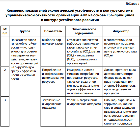 ESG (Environmental, Social, and Governance) — это набор принципов и показателей, используемых для оценки устойчивости и социальной ответственности организаций. В агропромышленном комплексе (АПК) показатели ESG могут быть применены для оценки и улучшения экологической, социальной и управленческой производительности [1]. Среди показателей ESG принципов в АПК отметим следующие: