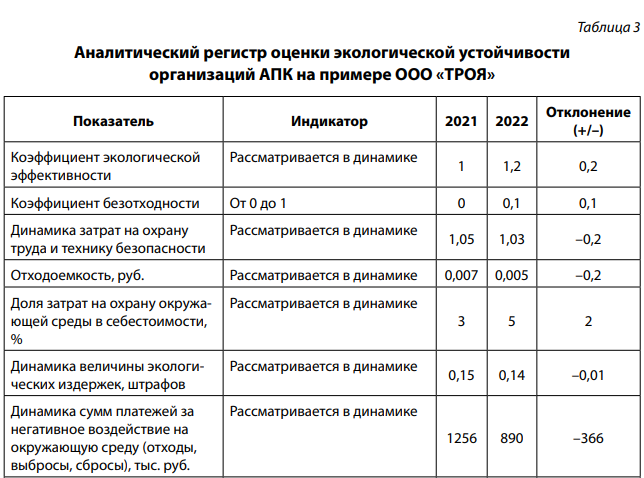 В табл. 1 и 2 заложен общий принцип формирования комплекса опорных показателей системы управленческой отчетности организаций АПК на основе ESG-принципов в контуре устойчивого развития. Рассмотрим в табл. 3 форму показателей аналитического регистра оценки экологической устойчивости организаций АПК на примере ООО «ТРОЯ».
