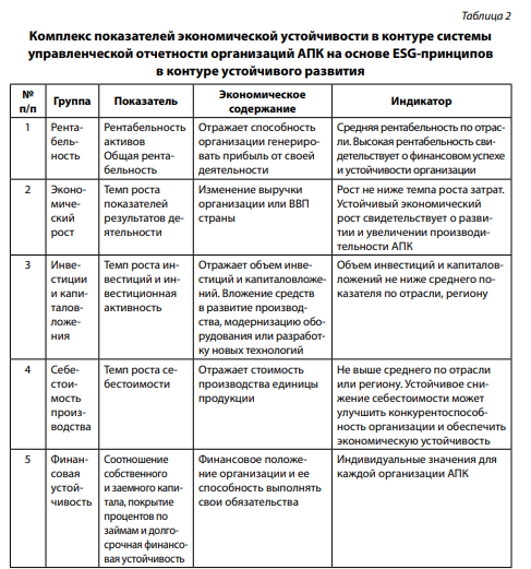 Показатели экономической устойчивости помогают оценить финансовую производительность и устойчивость организаций АПК. Они позволяют оценить финансовую устойчивость, эффективность использования ресурсов и конкурентоспособность организаций в рамках устойчивого развития АПК на основе ESG-принципов.