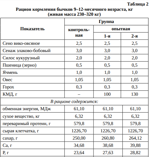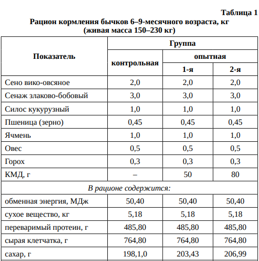 В возрасте 6–9 мес рацион бычков содержал 50,40 МДж обменной энергии, а в 9–12-месячном – 105,0 МДж. Рацион животных в 6–9-месячный период выращивания представлен в таблице 1.