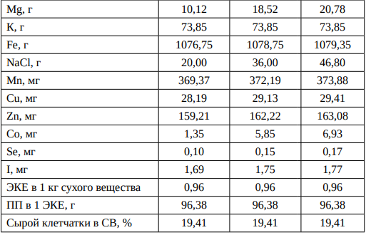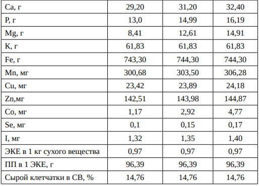 Увеличение дозы комплексной минеральной добавки до 100–130 г/гол. в сутки способствовало лучшей обеспеченности животных кальцием, фосфором, магнием, марганцем, медью, кобальтом, селеном. Обеспеченность ЭКЕ переваримым протеином 96,38 г, содержание клетчатки в сухом веществе составило 19,41 %.
