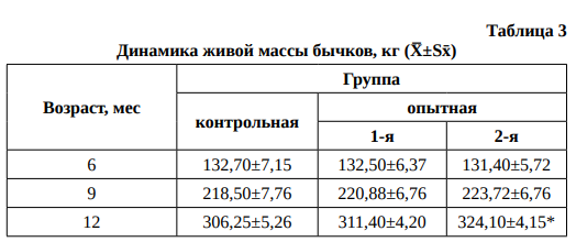 3. Живая масса бычков контрольной группы в возрасте 12 мес составила 306,25 кг, в опытных – 311,40 и 324,10 кг, превосходство составило 5,15 и 17,85 кг (p < 0,05).