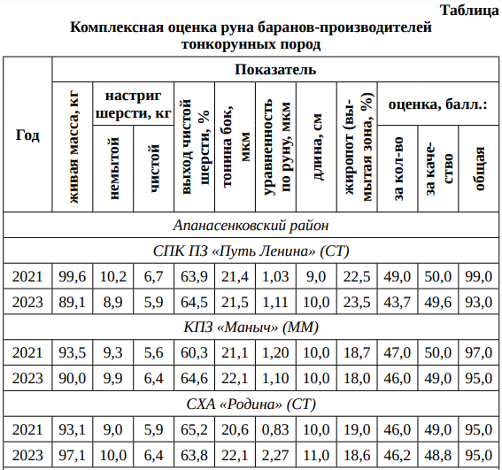 Положительным моментом является стабилизация на определенном уровне качественных показателей шерстной продуктивности. Средний диаметр шерстного волокна находится в пределах 20,6–22,5 мкм, что соответствует требованиям производства тонкорунной шерсти. Выход чистой шерсти, на показатели которого оказывают влияние засушливые природные условия, колебался от 60,3–65,2 %. Это по шкале комплексной оценки рун имеет оценку «отлично».