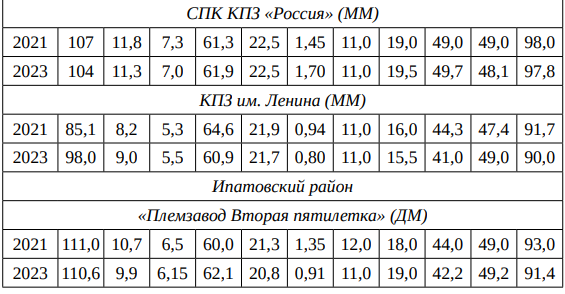 Анализ результатов исследований основных свойств шерсти баранов-производителей в 2021 и 2023 гг. представлен в таблице.
