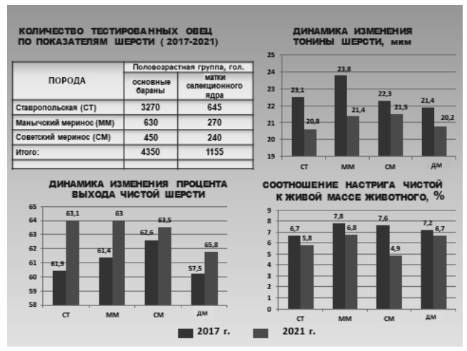 Применение лабораторных приемов и методов оценки, количественных и качественных показателей шерстного сырья в селекции тонкорунных пород за последние пять лет (4350 гол.) в результате тестирования 3270 гол. ставропольской породы, 630 гол. – породы манычский меринос, 450 гол. – породы советский меринос и 310 гол. – породы джалгинский меринос выявило, что утонение шерсти (в среднем по породе) произошло, соответственно, по породам на 2,3; 2,4; 0,8 и 1,2 мкм. Выход чистой шерсти, в свою очередь, увеличился, соответственно, по породам на 1,2; 1,6; 0,9 и 8,3 абс.%. Соотношение настрига к живой массе животных снизилось, соответственно, на 0,9; 1,0; 2,7 и 0,5 абс.%.