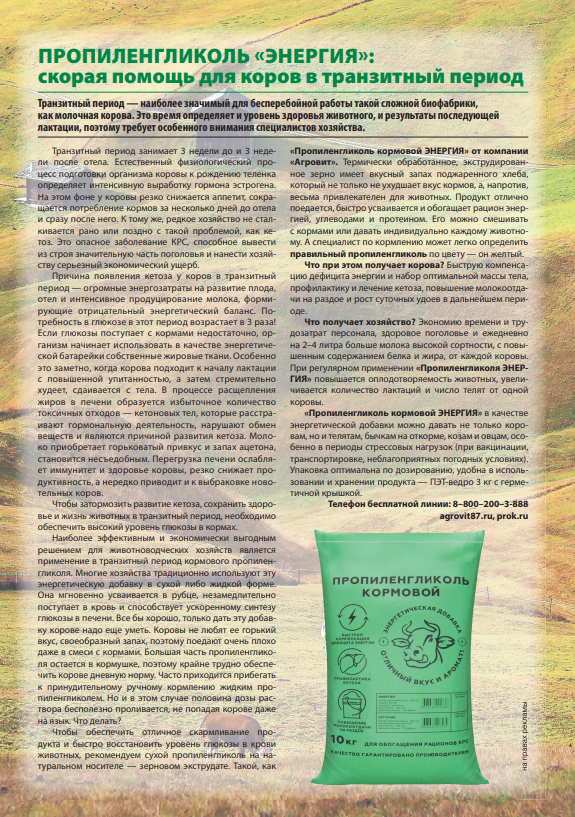 Статья "Кормовая добавка Пропиленгликоль «Энергия»" Журнал "Главный зоотехник / Head of Animal Breeding"