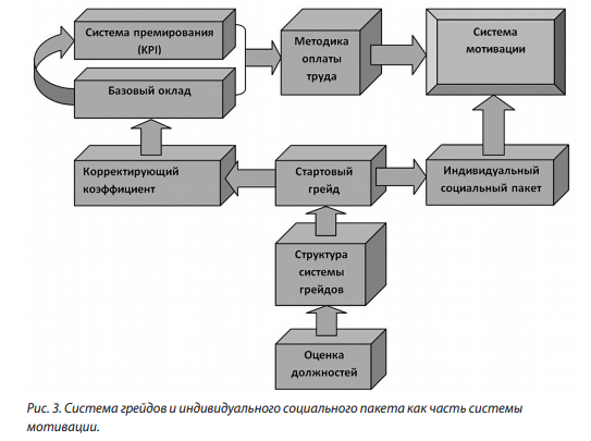 Для решения данной проблемы предлагаем ввести в эксплуатацию систему грейдов, базирующуюся на использовании гибких премиальных схем и индивидуального социального пакета (рис. 3). Такая система предполагает ранжирование существующих должностей по уровням в зависимости от вклада в общее дело, степени возлагаемой ответственности и внутренних особенностей организационной структуры. На базе грейдирования составляется индивидуальный социальный пакет.