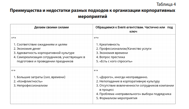 Сталкиваясь с таким количеством проблем и нюансов, невольно возникает идея: почему бы не обратиться за помощью к event‑агентству и не отдать все в руки профессионалов. Для ответа на данный вопрос мы рассмотрели преимущества и недостатки обоих подходов (табл. 4).
