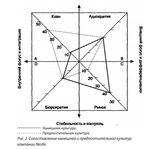 Таким образом, в компании Nestle преобладает рыночная культура, так как идет большой акцент на повышение конкурентоспособности, увеличение доли рынка, получение прибыли и ориентация на результат. Также в компании ярко выражен адхократический тип культуры: приветствуются инициативы сотрудников и новаторский подход, присутствует работа в проектных командах, важно быть лидером на рынке. Бюрократические черты проявляются в любви к долгосрочным перспективам: планам, инвестициям, прогнозам. Учитывая, что бизнес‑единицы компании разбросаны по всему миру, ей приходится уделять не малое внимание законодательству и вести свою деятельность в строго формализованных рамках и в соответствии с официальной политикой. В некоторой степени присутствуют элементы клановой культуры, они выражены в первую очередь в стиле управления компании, а точнее — в отношении к подчиненным, так как сами лидеры подбираются больше как представители адхократической культуры: творческие, креативные, готовые идти на риск