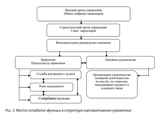 Следовательно, мы видим, что причин для внедрения системы достаточно. Теперь главный вопрос, решением которого нам предстоит заняться, — каким образом осуществляется внедрение compliance management в структуру бизнеса. Прежде всего, для этого определим место compliance-функции в структуре управления (рис. 5).