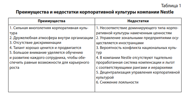 Результаты анализа корпоративной культуры Nestle показали, что во многом компания успешно достигает целей, поставленных перед собой, посредством управления корпоративной культурой, однако существует разрыв между направлениями корпоративной культуры и намеченными стратегическими приоритетами. Как и любая сложная многофункциональная система, корпоративная культура Nestle имеет свои преимущества и недостатки. Как принято, официальные источники в основном не говорят о реально существующих проблемах в компании, дабы не демонстрировать конкурентам свои слабые места, поэтому, проанализировав мнения сотрудников компании и их ощущения от работы в ней, можно составить следующую консолидирующую таблицу, в которой отражены основные выявленные преимущества и недостатки корпоративной культуры (см. табл. 1).