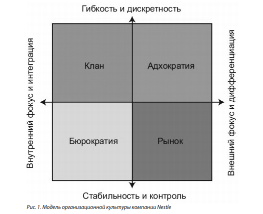 Для того, чтобы разработать план мероприятий по адаптации культуры, воспользуемся описанной типологией К. Камерона и Р. Куинна [1]. Напомним, что авторы выделяют четыре модели организационной культуры, подчеркивая, что не существует организаций с монокультурой. Каждый тип в той или иной степени присутствует в корпоративной культуре, поэтому попробуем классифицировать культуру Nestle (рис. 1).