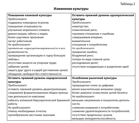 В рамках принятой компанией концепции «Создавая общие ценности» переход от рыночной к клановой культуре является целесообразным. Рыночная культура довольно агрессивна и направлена на получение все большей и большей прибыли, что не соответствует социальным настроениям компании Nestle. К тому же, являясь одним из крупнейших производителей продуктов питания, компания имеет большую долю рынка, а значит, может позволить себе более спокойные методы ведения бизнеса, направленные на усиление существующих позиций и социальную ответственность бизнеса перед обществом. В табл. 2 определены стержневые положения и принципы, описывающие, что предполагают и не предполагают вносимые изменения в перестановке акцентов в типах культуры.