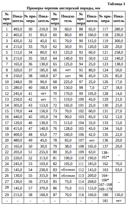 Для примера приведем данные измерений черепов англерской породы (табл. 1). Стоит отметить тот факт, что большинство черепов крупного рогатого скота, представленные в коллекции музея, исследуются без нижней челюсти по причине их неудовлетворительного состояния (имеют значительные дефекты, не позволяющие достоверно определить данные измерений).