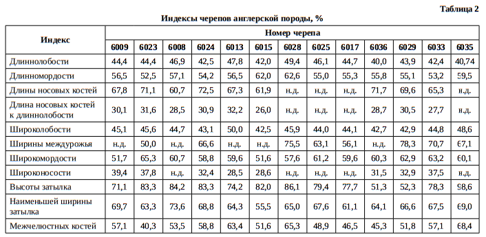 Индекс длиннолобости характеризует отношение длины лба к общей длине черепа. Значения данного индекса варьировали от 40,74 до 49,4 %. В пределах одной породы возможно распределение данных на 3 группы по длиннолобости черепа (длиннолобые, среднедлиннолобые, коротколобые). Пределом для каждой группы будет значение 3,1. Первая группа: длиннолобые со значением индексов 46,3–49,4 % – составила 3 черепа, или 23,0 % от общего количества измеренных черепов. Вторая группа – среднедлиннолобые со значением индексов 43,2–46,2 % – 5 черепов, или 38,5 %. Третья группа – коротколобые со значением индексов 40,0–43,1 % – 5 черепов, или 38,5 %.