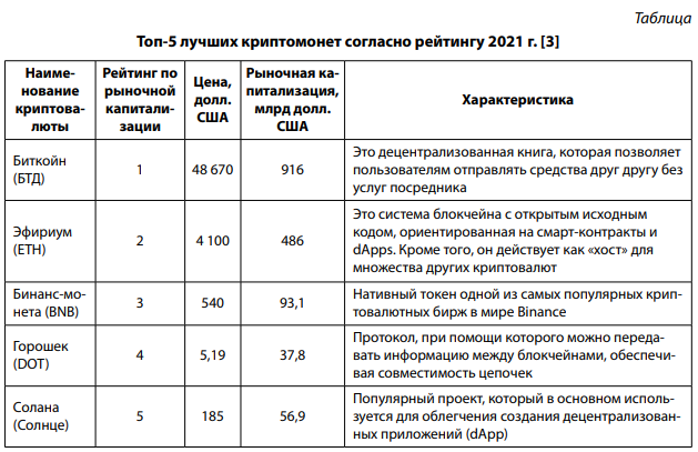 Самыми популярными версиями криптовалюты являются биткойн и эфириум, однако в обращении находится более 19 тыс. ее различных видов. Биткойн был первой криптовалютой, впервые описанной Сатоши Накамото в статье 2008 г. под названием «Биткойн: одноранговая электронная кассовая система». Автор описал проект как «электронную платежную систему, основанную на криптографическом доказательстве, а не на доверии» [7]. В течение 2021 г. на рынке криптовалют наблюдался устойчивый рост числа новых пользователей и активных кошельков. Больше пользователей, чем когда-либо, начинали изучать данный рынок. В таблице 1 представлено пять лучших криптомонет согласно рейтингу 2021 г.