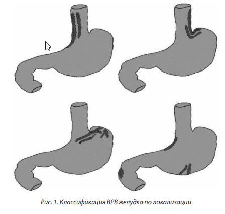 При варикозном расширении ВРВ желудка выделяют четыре типа вен: I тип — гастроэзофагеальные ВРВ с распространением на кардиальный и субкардиальный отделы малой кривизны желудка; II тип — гастроэзофагеальные ВРВ от эзофагокардиального перехода по большой кривизне в направлении ко дну желудка; III тип — изолированные ВРВ же лудка без ВРВ пищевода — варикозная трансформация вен фундального отдела желудка; IV тип — эктопические узлы тела, антрального отдела желудка, двенадцатиперстной кишки (рис. 1) [2].