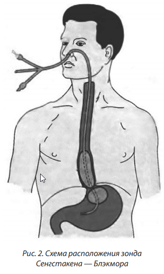После установления диагноза «кровотечение из ВРВ пищевода или желудка» и изъятия эндоскопа часто используют зонд-обтуратор Сенгстакена — Блэкмора, чем достигается временный надежный гемостаз (рис. 2).