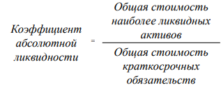 Коэффициент абсолютной ликвидности отражает обеспеченность организации наиболее ликвидными активами для погашения краткосрочных денежных обязательств организации. Она находится по следующей формуле.