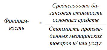 Показатель фондоемкости является обратным к показателю фондоотдачи и характеризует величину основных средств, необходимую для производства единицы продукции (медицинских товаров и услуг) стоимостью в 1 рубль. Он рассчитывается по формуле.