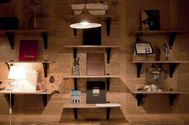 Вход, гардероб, стойка бара, зал со столиками должны соответствовать литературной тематике. Для начала стоит остановиться на аскетичном стиле интерьера. Деревянная мебель и стеллажи из недорогой сосны, обивка стен тканью, самодельные светильники — старые птичьи клетки, переделанные ретросветильники. Главное — не богатство интерьера, а оригинальность формы. Возможно в отдельных зонах кафе размещение рекламной продукции издательства или авторов, на договорных основах.
