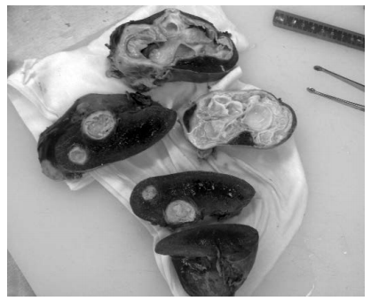 Макропрепарат (рисунок): селезенка размерами 14,0×9,0×6,5–3,0 см, одна треть поверхности шероховатая в виде клетчатой фиброзно-жировой ткани на разрезе, множественные кисты, сливающиеся между собой, диаметром 1–5 см, выполненные белесоватой, прозрачной жидкостью, а некоторые – коричневатым содержимым. Стенка одной из больших кист с выраженным обызвествлением. В других участках ткань селезенки обычного вида с обильным соскобом пульпы. Заключение: в результате макро- и микроскопического исследования доставленного материала определяется картина эхинококкоза селезенки, вероятно однокамерного.