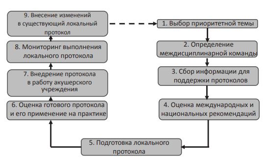 Следует отметить, что при появлении новых данных либо утверждении нового национального протокола следует немедленно внести изменения в существующий локальный протокол. Такой процесс создания и последующего пересмотра локального протокола является циклическим и при правильном выполнении всех вышеописанных шагов обеспечит надежность и эффективное применение существующих практик в работе стационара. По данным зарубежной литературы, как правило, пересмотр локального протокола должен производиться каждые 3–5 лет.