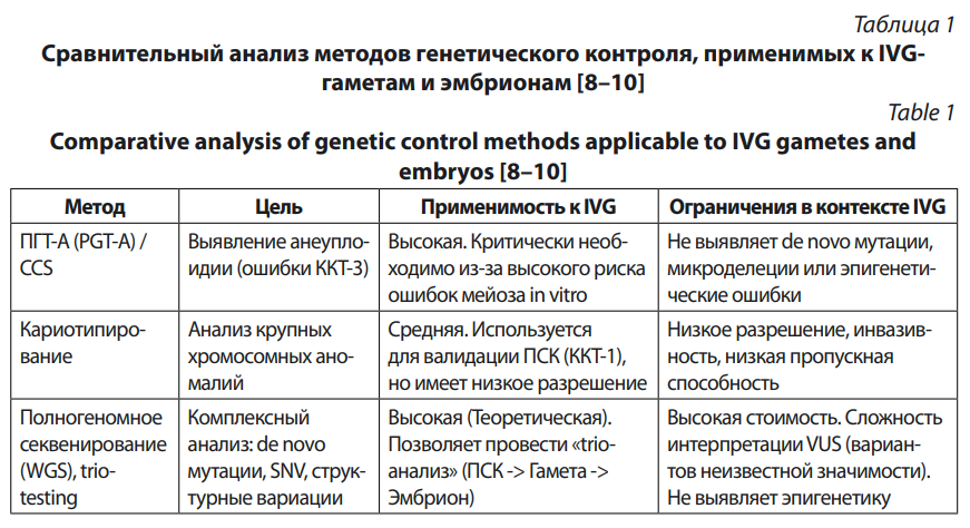 Проведенный анализ результатов выявляет четкую иерархию рисков. Проблемы генетического контроля (ККТ-1 и ККТ-3), такие как анеуплоидия и de novo мутации, являются серьезными, но технически решаемыми. Развитие ПГТ-технологий методом NGS, полногеномное секвeнирование в рамках трио-теста, как показано в табл. 1, позволяет с высокой долей уверенности идентифицировать генетически аномальные гаметы или эмбрионы.