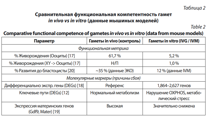 Эти данные указывают на более чем 10‑кратное падение эффективности и функциональной компетентности. Причины этого сбоя носят молекулярный характер. Сравнение in vitro созревших (IVM) и in vivo ооцитов выявляет тысячи генов с дифференциальной экспрессией (DEGs). Исследования показывают от 1,864 [18] до 2,627 [12] DEGs у мышей. Выявленные DEGs часто связаны с нарушением метаболизма, в частности с путями окислительного фосфорилирования (OXPHOS), что указывает на высокий уровень метаболического стресса в условиях in vitro. IVG-ооциты демонстрируют значительно сниженную экспрессию ключевых материнских транскриптов, необходимых для раннего развития эмбриона, таких как Gdf9 и Mater [19]. В табл. 2 обобщены данные о функциональном разрыве между in vivo и in vitro гаметами.