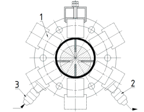Рис. 1. Схема опытного образца РПМ с магнитным отжимом пластин: 1 — магнитная вставка, 2 — нагнетательный штуцер, 3 — всасывающий штуцер