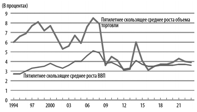 До мирового финансового кризиса мировая торговля росла почти вдвое быстрее, чем ВВП. Как видно на рисунке, теперь темпы роста сравнялись.