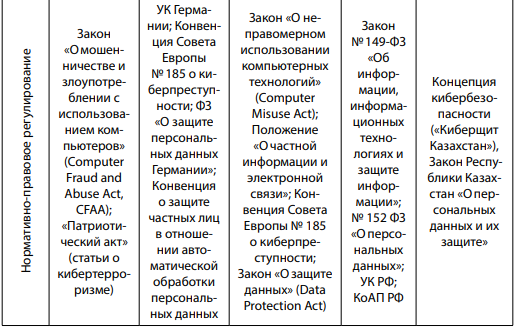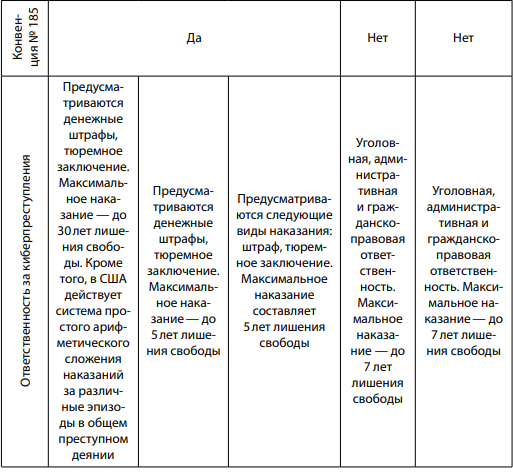 Как показали результаты анализа, законодательное понимание киберпреступности в каждой из стран совпадает и предполагает хищение данных посредством информационных технологий, а нормативно-правовое регулирование поэтапно развивается. Конвенцию Совета Европы о киберпреступности ETS № 185 подписали 46 стран, однако Россия к ним не присоединилась [9]. Что касается ответственности за киберпреступления, она схожа для различных стран: это штрафы и тюремные заключения, однако в США санкции носят более жесткий характер, чем в других странах.