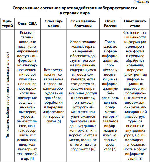 В таблице представлен сравнительный анализ уровня развития механизмов противодействия киберпреступности в России, США, Германии и Великобритании.