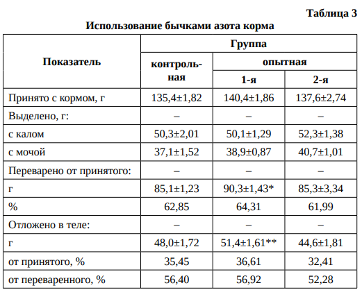Значение химических реакций переваривания заключается главным образом в подготовке питательных веществ к дальнейшему их усвоению. Животные 1-й опытной группы отложили в теле азота больше на 7,08 % (p < 0,01) и усвоили от принятого с кормами на 0,52 абс.% больше по сравнению с контролем.