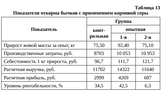 Из-за более значительных затрат на покупку и раздачу кормовой серы производственные затраты при откорме бычков 1-й и 2-й опытных групп были выше в сравнении с контрольной группой на 1350 и 2250 руб. (табл. 13).