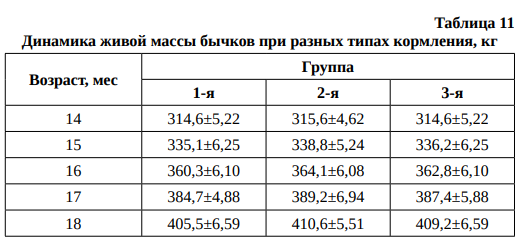 В опыте 18-месячные бычки, получавшие сенажный рацион, имели большую живую массу, по сравнению с массой сверстников из других групп. Так, превышение над бычками при сенном типе кормления составило 1,26 %, при силосном – на 0,34 %. Необходимо отметить, что живая масса бычков в течение опыта увеличивалась равномерно при постоянном превосходстве бычков 2-й группы (табл. 11).