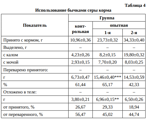 Животные 1-й опытной группы, получавшие 15 г серы, переварили на 1,46 абс.% (p < 0,05) больше, чем в контрольной группе, и отложили в теле 51,4 г азота. Бычки 2-й опытной группы переварили азота гораздо меньше, коэффициент переваримости у них был ниже на 0,86 абс.%, чем у контроля.