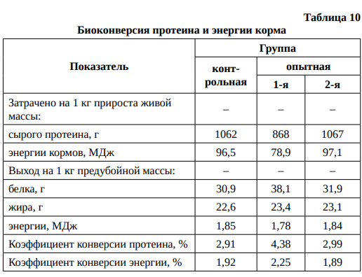 Переход протеина кормов при откорме крупного рогатого скота при восполнении недостатка серы увеличился в 1-й опытной группе до 4,38 %, что на 1,47 абс.% выше, чем в контрольной группе. Энергия корма аккумулировалась в съедобной части туши у бычков 1-й опытной группы на 0,33 абс.% лучше по отношению к контрольной группе.