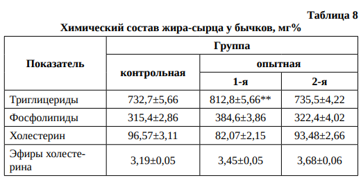 Большее количество триглицеридов содержалось в жире-сырце у бычков 1-й опытной группы, получавших оптимальное количество серы в рационе. Концентрация триглицерида у бычков 2-й опытной группы составила 735,5 мг%, что в целом равно его содержанию у бычков контрольной группы, т. е. увеличение количества серы в рационе не повышало качество жира у бычков (табл. 8).