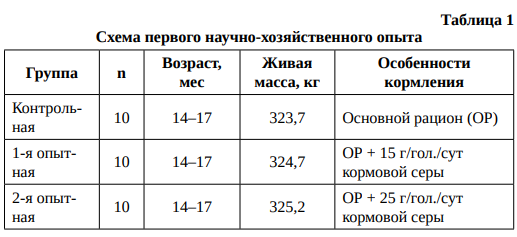 Целью первого научно-хозяйственного опыта была оценка влияния на откормочные качества бычков мясных пород кормовой серы, введенной в рацион в виде минеральной добавки (табл. 1).