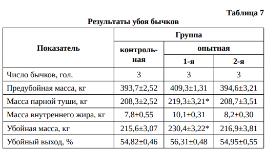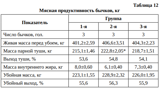Убойный выход у животных опытных групп был выше и достигал 54,95–56,31 %.