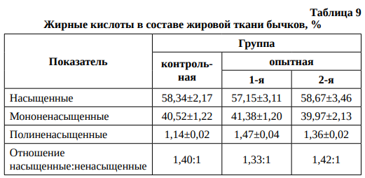 Концентрация насыщенных жирных кислот, определяющих плотность жировой ткани, у бычков контрольной группы (58,34 %) была выше, чем в других группах (табл. 9).