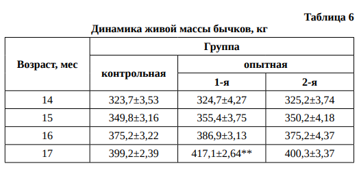 Данные об изменении живой массы бычков приведены в таблице 6 и показывают, что бычки, получавшие по 15 г кормовой серы, были по живой массе на 17,9 кг (p < 0,01) больше, чем контрольные сверстники, и на 14,3 % больше, чем сверстники 2-й опытной группы. Значительное понижение живой массы у бычков 2-й опытной группы, в сравнении с 1-й группой, говорит о том, что большая доза препарата отрицательно влияла на результаты откорма.
